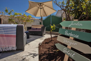 Garten von 300 m² mit Sonnenliegen, Essbereich und Sommerküche (Grill und Plancha)