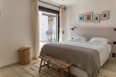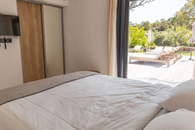Schlafzimmer 1: Queensize-Bett 160 * 200 mit Stauraum, TV und Zugang zur terrasse/zum Pool.