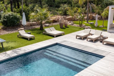- Poolhaus und möblierte terrasse mit Ruhebereich, Sonnenbaden und Sonnenschirmen.