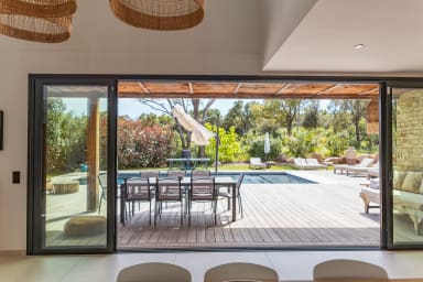 Ein großes Wohnzimmer mit TV / Esszimmer mit großen raumhohen Fenstern, die den Zugang zur terrasse und zum Pool ermöglichen.