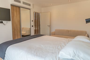 Schlafzimmer 5: Master-Suite, Kingsize-Bett 190 * 200 mit Stauraum, TV, WC und Duschbad. Private Terrasse.