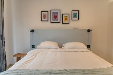 Schlafzimmer 2: Queensize-Bett 160 * 200 mit Stauraum, TV und Zugang zum Garten.