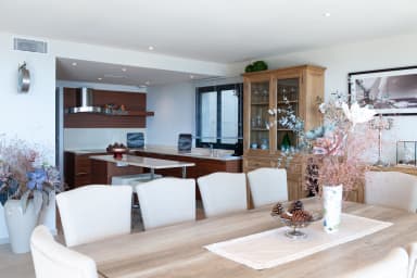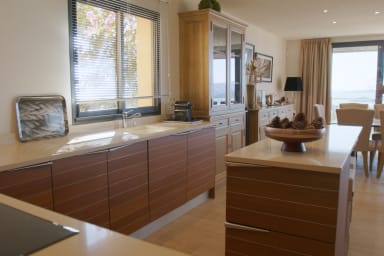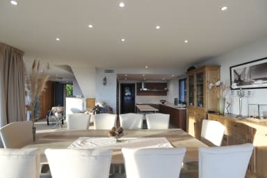 As soon as you enter, you discover a large living space with generous volumes, consisting of an elegant living room and a bright dining room, open to the sea horizon thanks to large bay windows. These spaces naturally extend to a large terrace covered by a wooden pergola, equipped with a lounge lounge and an outdoor dining room, ideal for sharing meals facing the sea, from breakfast to dinner at sunset.