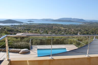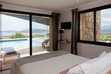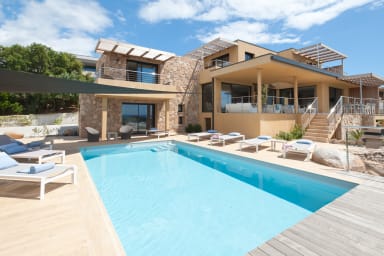 Located on the heights of Arasu, in the highly sought-after area of Cirindinu, Villa Petra Rossa overlooks the magnificent bay of Saint-Cyprien and is located in the immediate vicinity of the emblematic Cabanon Bleu beach.