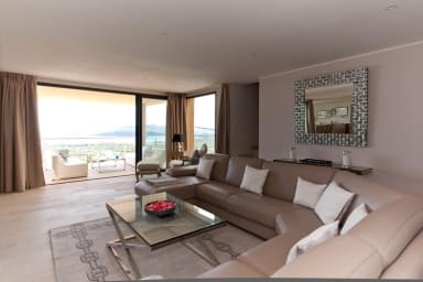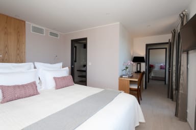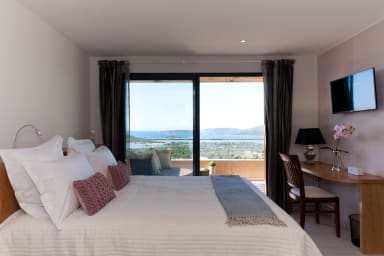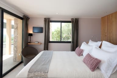 Three main bedrooms, distributed on the left and right wings of the villa, each have a 160 × 200 bed, a private walk-in shower room, a TV, a Bluetooth speaker and access to a terrace with sea view.