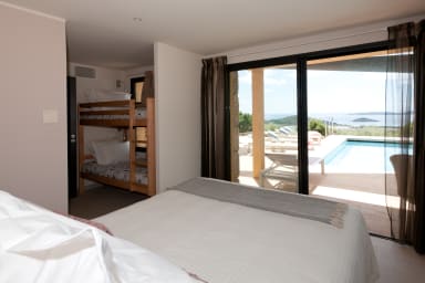 A fourth bedroom, located at the level of the swimming pool terrace, is ideal for a family with children: 160× 200 bed, bunk beds (2× 80), shower room, TV
