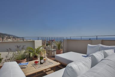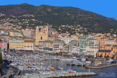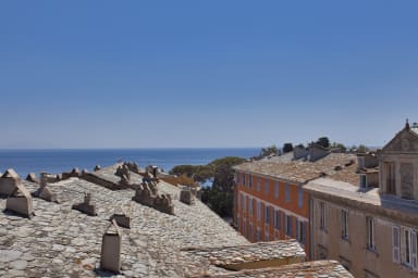 L’immense terrasse baignée de soleil, révèle une vue éblouissante sur le vieux port de Bastia où se mirent les deux campaniles de l’Eglise Saint Jean-Baptiste, ô combien emblématique de la ville, ainsi que sur sa Citadelle d’où émerge le clocher de la cathédrale Sainte Marie.
