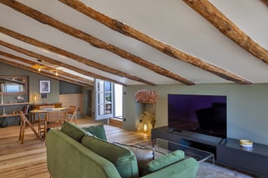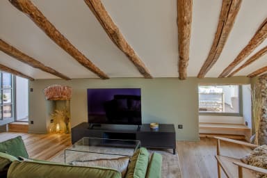 -un grand séjour, salle à manger avec TV écran plat se prolongeant sur une terrasse de toit de 35m2 aménagée
