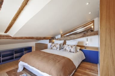 Situé au dernier étage (6ème étage sans ascenseur) d’un immeuble du centre historique de Bastia, sous des plafonds mansardés, on capte la lumière dans des espaces savamment imaginés par notre architecte.