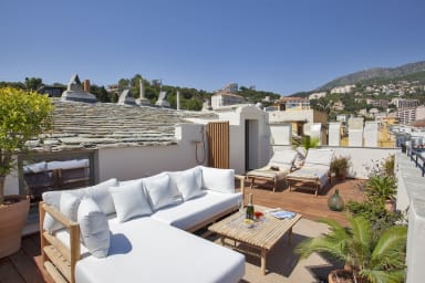 Cette terrasse/rooftop, de 35m2, possède un salon d’extérieur, 2 transats, un coin repas et une douche pour pouvoir se rafraîchir.