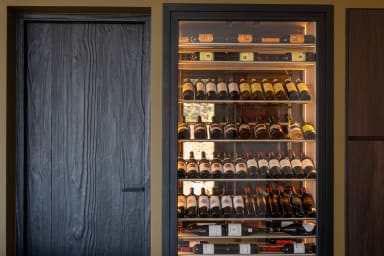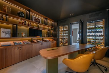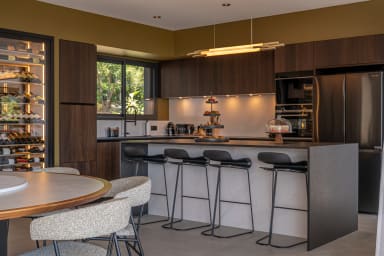 La cuisine intérieure ouverte offre un espace moderne et raffiné avec des appareils électroménagers haut de gamme, comprenant , une plaque de cuisson BORA, un four et un lave-vaisselle en hauteur, ainsi qu’un réfrigérateur américain, , un thermomix , une chambre froide et un congélateur. Une machine à glaçons et des machines à café Nespresso et Siemens encastrables complètent cet ensemble, tandis qu’un cellier attenant assure un rangement pratique et organisé.