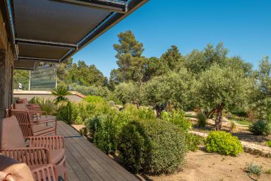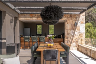 Un barbecue et une plancha viennent compléter ces espaces extérieurs, permettant de partager des repas gourmands dans une atmosphère résolument méditerranéenne.